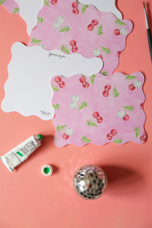 retro disco ball, cherry, wavy edge die cut notecard set