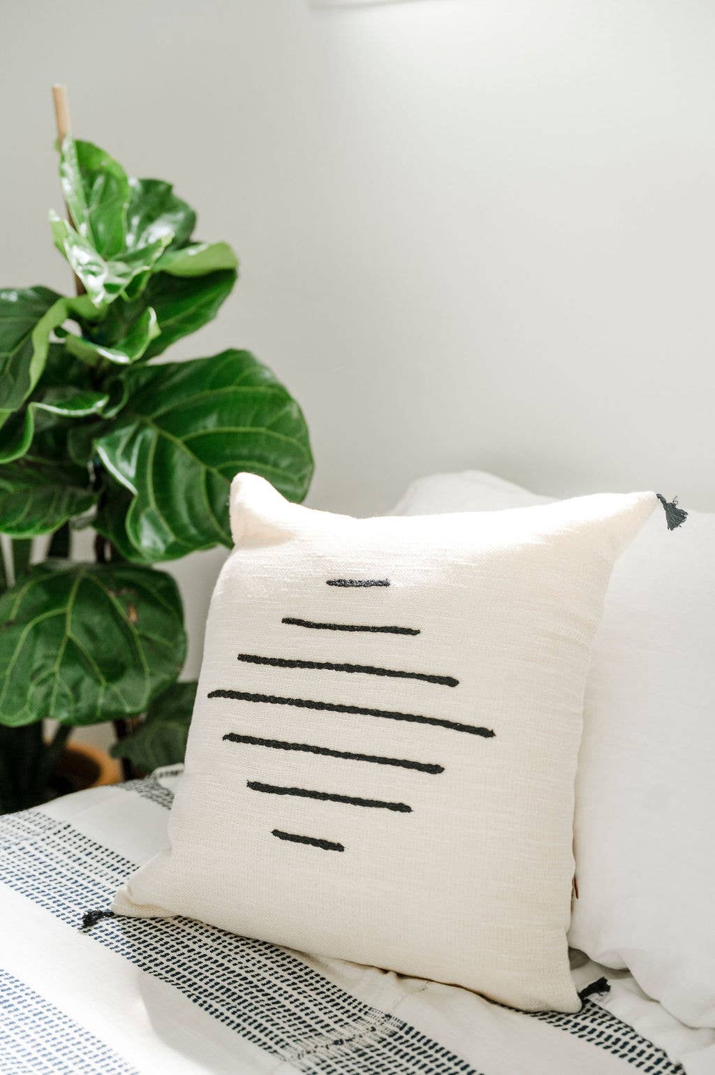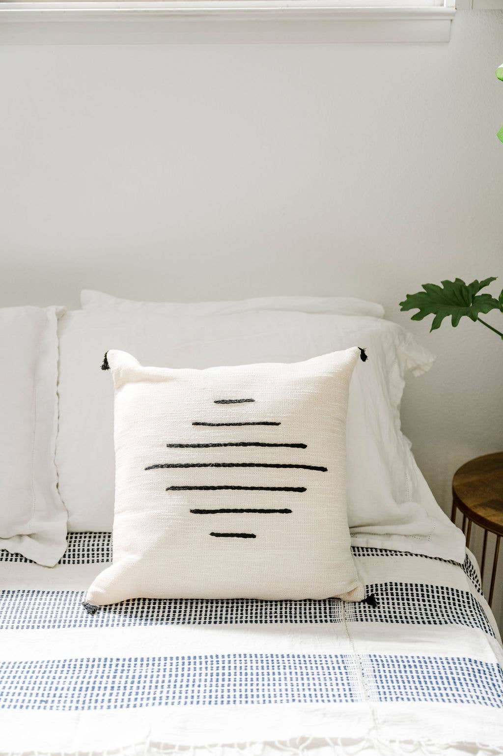 Designed in New York exclusively for Creative Women, this truly unique collection draws inspiration from Tunisia’s rich Berber heritage. The Hela Pillow, named for one of the inspiring women behind this collaboration, features hand-woven cotton embroidered with black wool and finished with petite tassels.