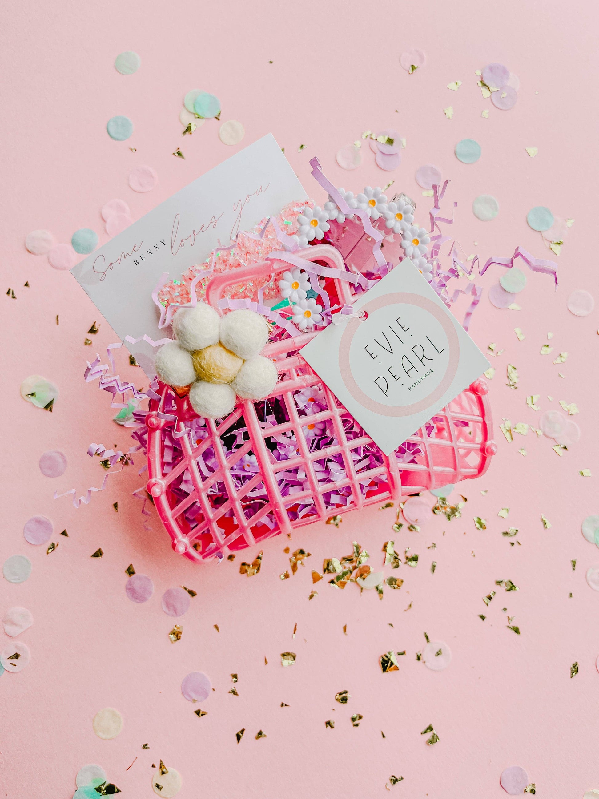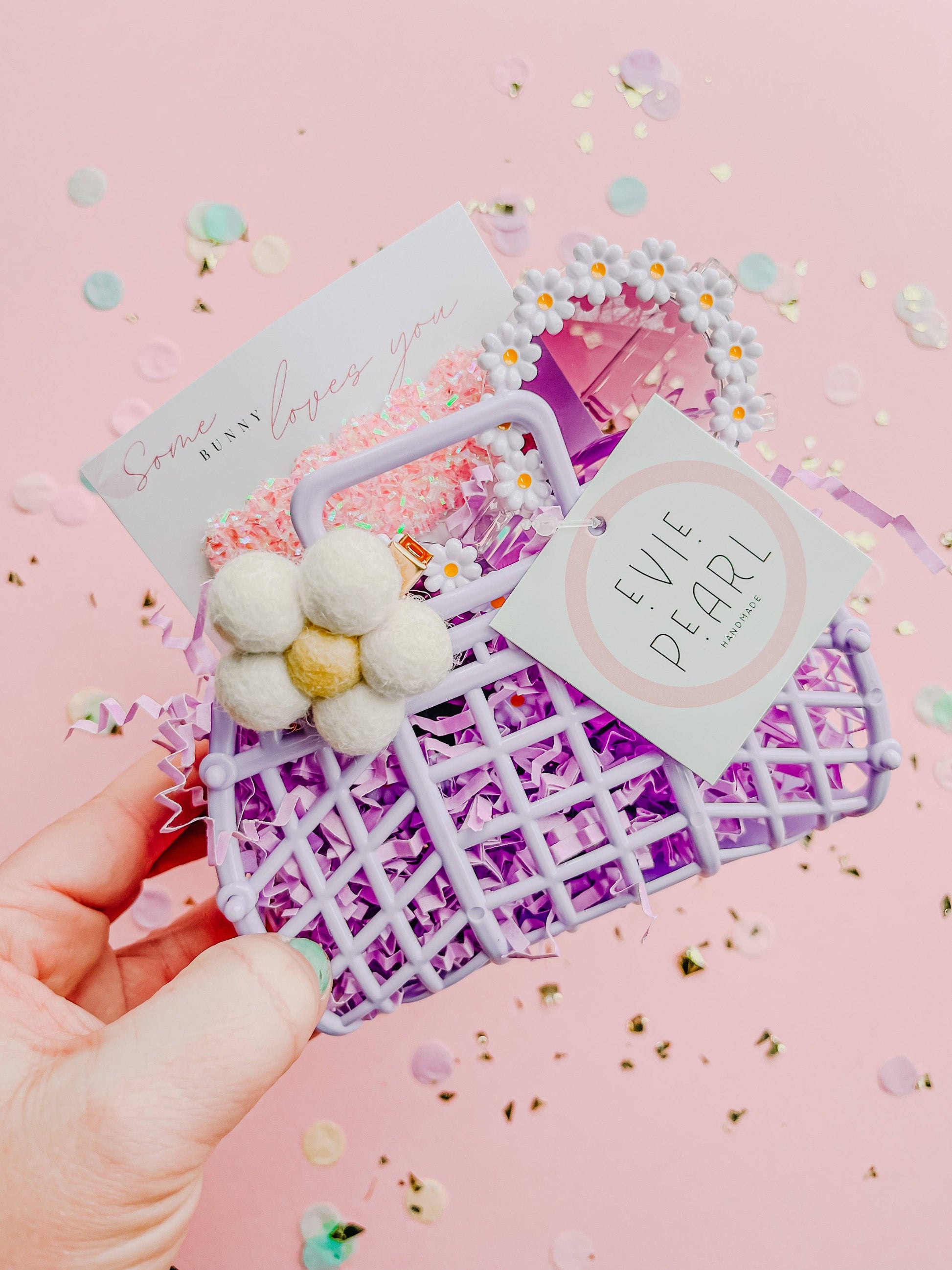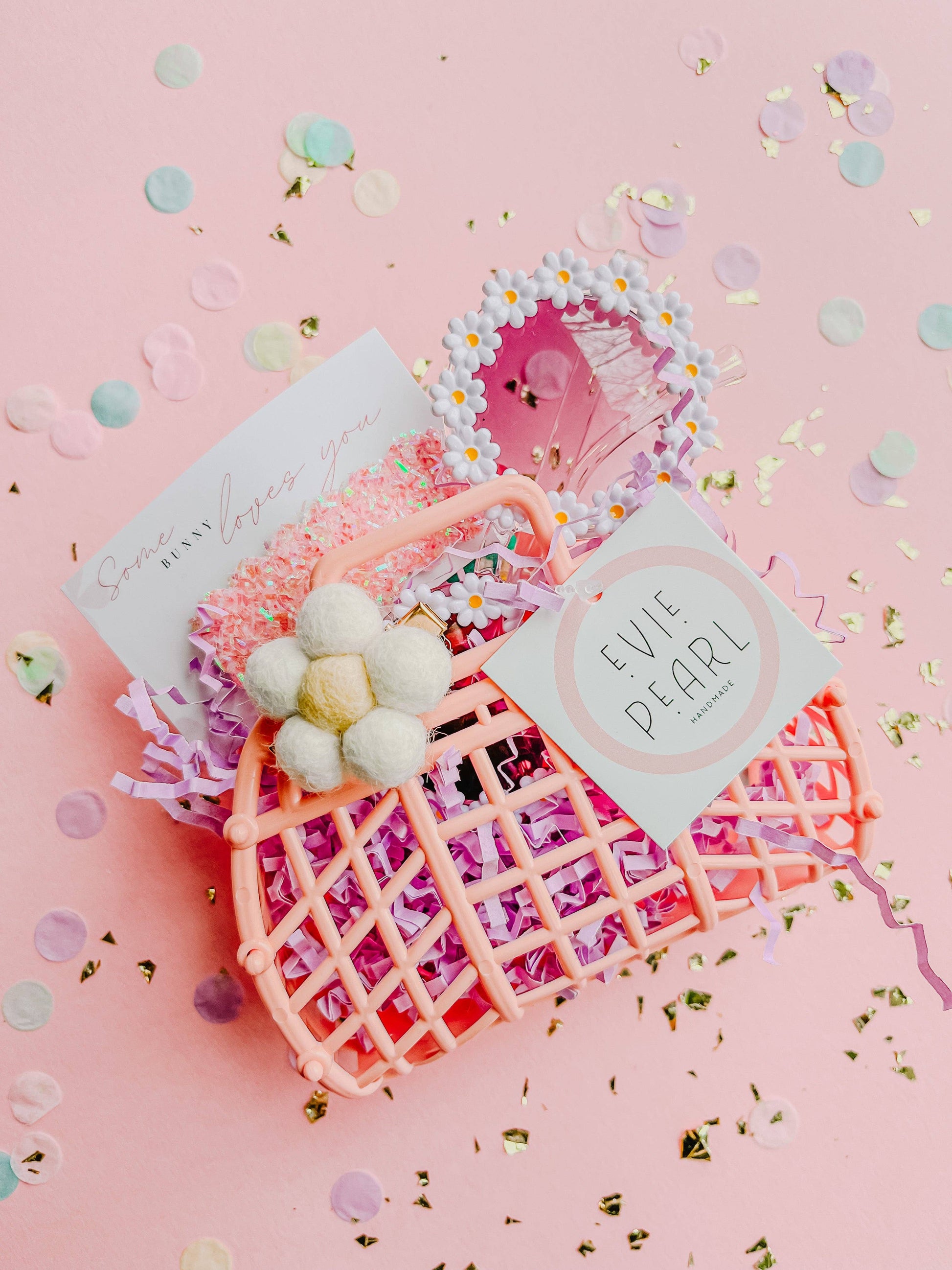 This listing is for one mini jelly bag, one pink easter grass snap clip, one white daisy sunnies, and one white daisy clip on a rose gold alligator clip. Each mini jelly bag is filled with peach- colored easter grass.