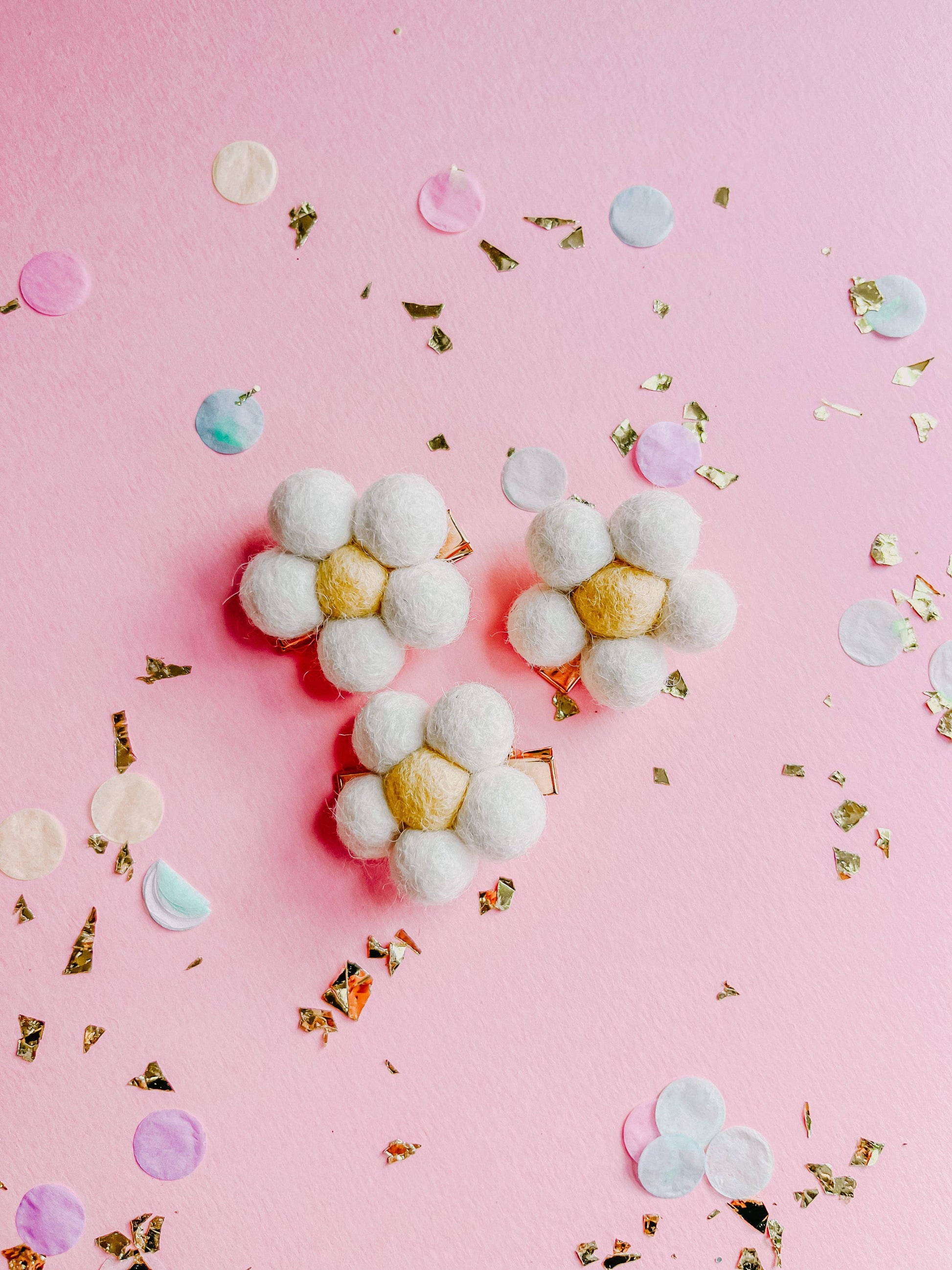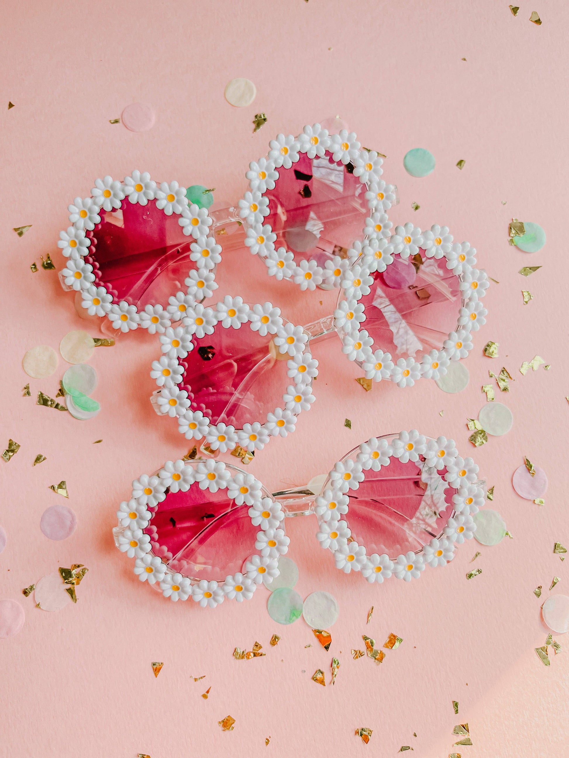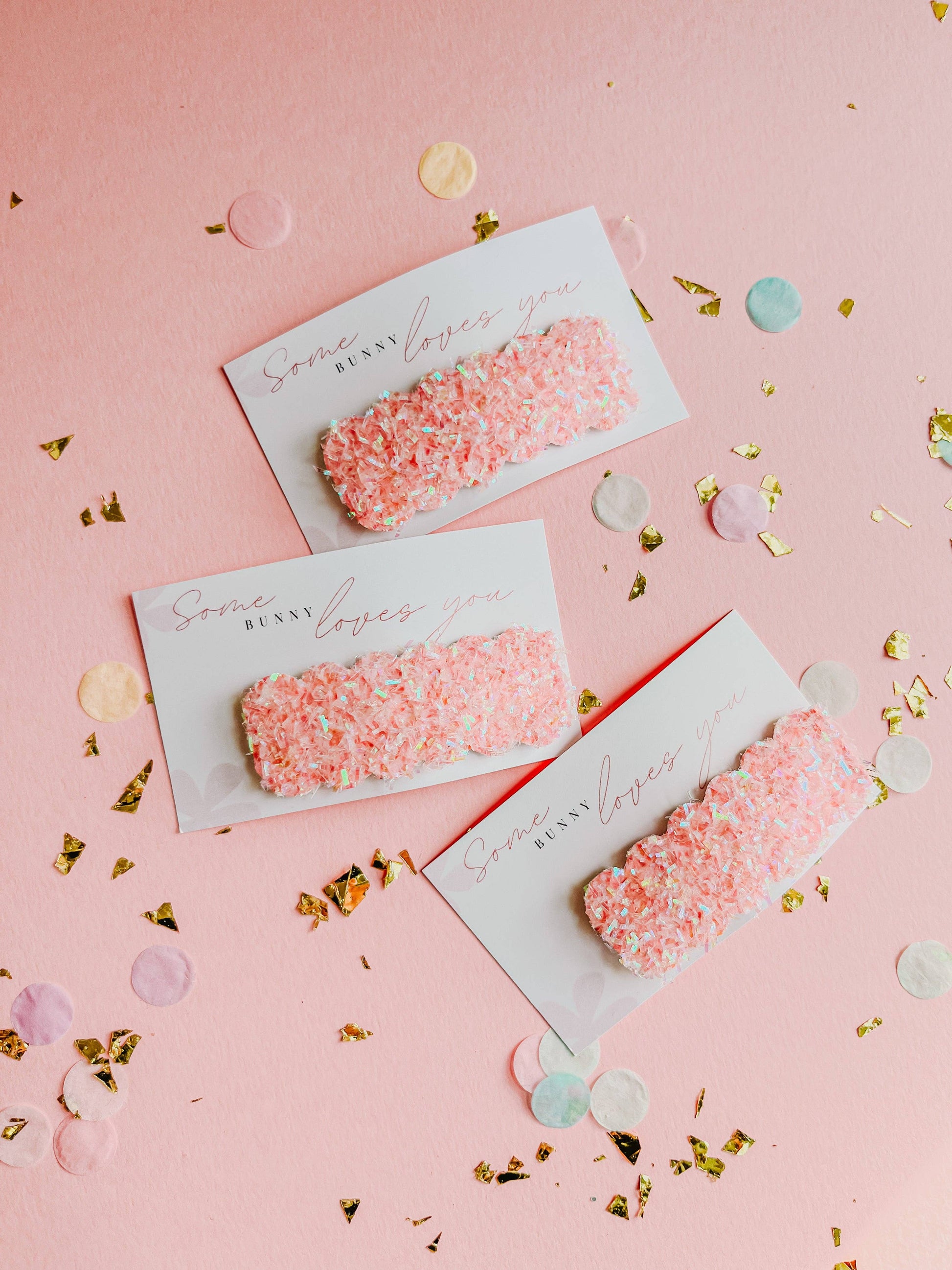 This listing is for one mini jelly bag, one pink easter grass snap clip, one white daisy sunnies, and one white daisy clip on a rose gold alligator clip. Each mini jelly bag is filled with peach- colored easter grass.